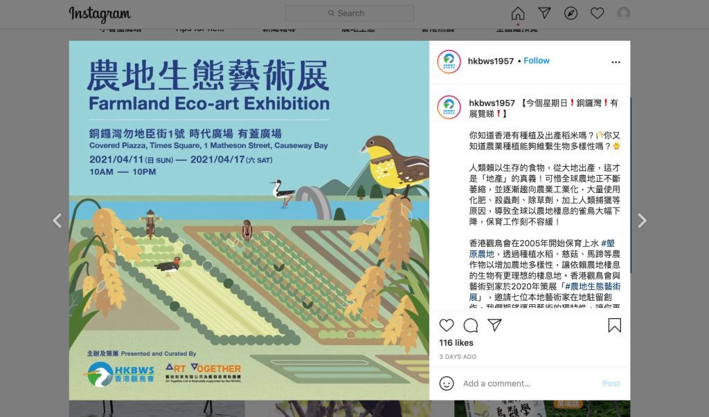 Five year-one students of Associate in Design (Visual Communication), namely Lee Nok-ching Jane, Man Chun-shing Jason, Mui Cheuk-nam Victor, So Cheuk-lam, and Tsoi Sze-wing, participated in the Farmland Eco-art Exhibition organised by the Hong Kong Bird Watching Society and Art Together. Each of them created a poster on the critically endangered and vulnerable species – yellow-breasted bunting. The small population of yellow-breasted bunting has been threatened by habitat loss, pesticides and human consumption. The exhibition was held from 11 to 17 April 2021 at the Covered Piazza of Times Square in Causeway Bay.