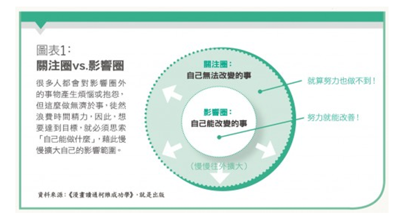 同學們確實需要學會活在當下,不要太計較得失,如矇上雙眼的鬥牛,只管往前衝,這樣才會獲得成果。又正如史蒂芬・理查茲・柯維(Stephen Richards Covey)的「關注圈/影響圈」理論,他指出關注圈指自己關心的事物所構成的範圍;影響圈則是關注圈中自己能控制的部分。史蒂芬・理查茲・柯維認為只要主動積極,先改變自己,專注在自己能做出改變的項目(影響圈內),就能擴大自己的影響圈(詳見附圖),並對周遭造成影響,讓事情朝想要的方向改善。而那些一生中,所有已經發生的過去,都必須列入個人無法控制的關注範圍,把它們忘掉,然後重新從自己可以控制的影響圈中努力。
