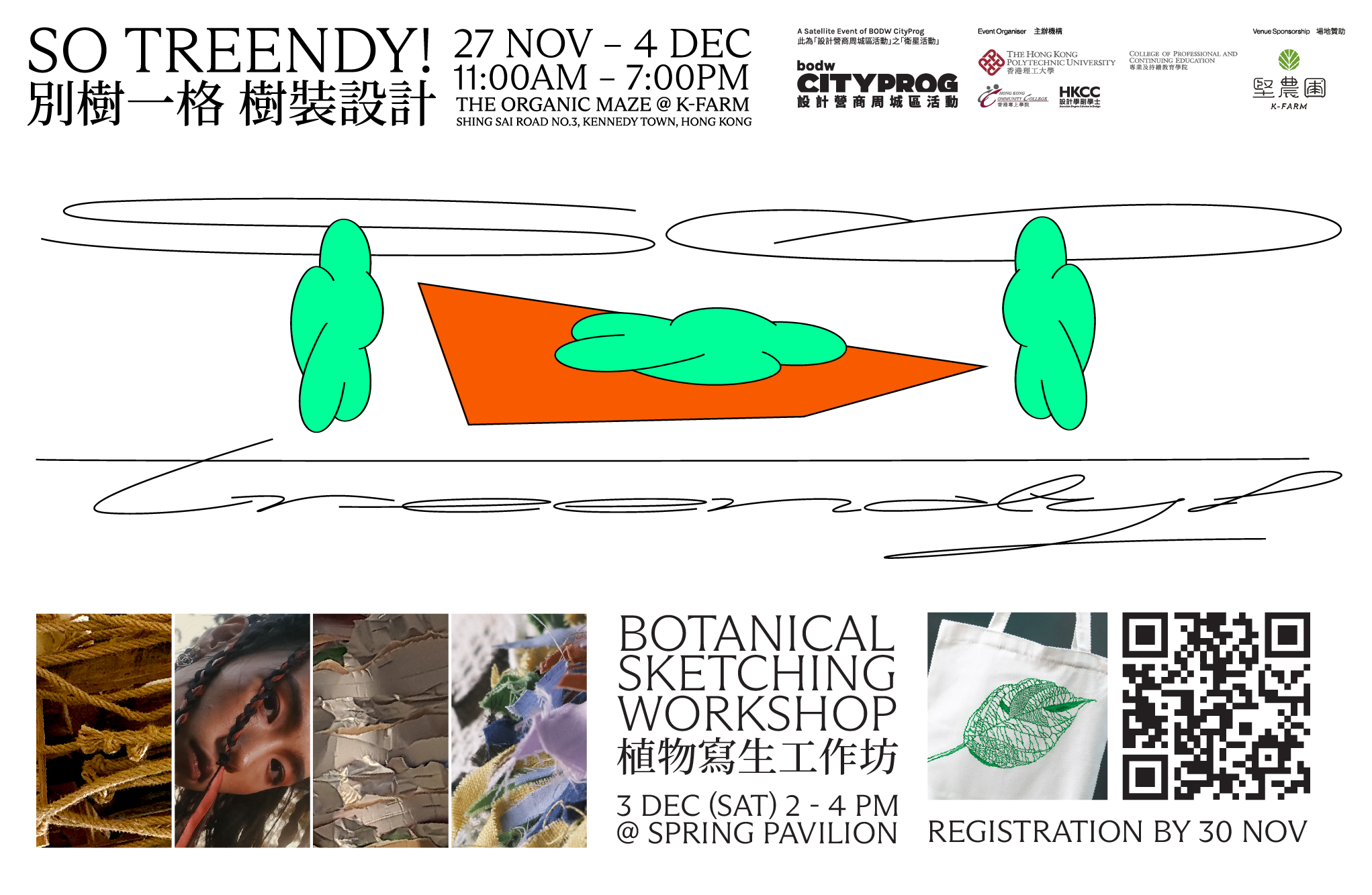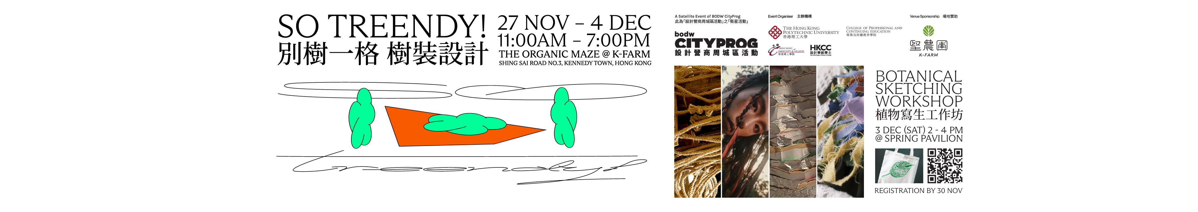 'Trendy'這個英文字,意味著時尚和現代。我們提出'treendy'作為一個新的角度來把「樹」和「時尚」這兩個完全不同的領域結合起來。本次展覽會在「堅.農圃」的有機迷宮中帶給觀眾五組有趣的「樹時裝」,我們希望您能對樹木有新的體會。